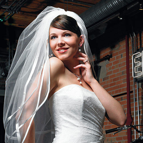 Double Border of Satin Ribbon & Pearls Veil Ivory