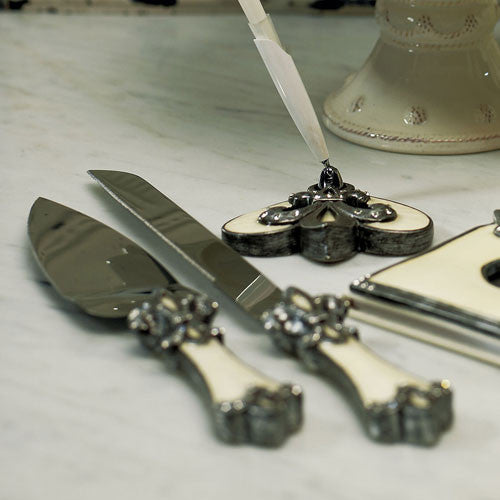 The stylized lily design of the Fleur de Lis is captured flawlessly in this majestic Cake Serving Set. Masterfully crafted of poly resin with hand painting and crystal accents. Stainless steel blades. Set includes Knife and Server. Stainless Steel blades.